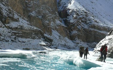 Set off to the North a little up and down over moraines again along the river Saspol Tokpo. You come across a dried up lake (called Zingog) which can sometimes be used as a water supply dam. About 100 m away there is a small yellow lake called Tso Sermo. After an hour one comes across an abandoned shepherds place. Just before arriving in the Base Camp which is at a junction of three valleys, one has to cross a river. Camp for overnight.